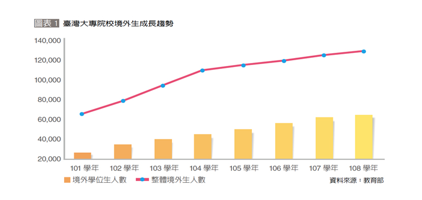 民國100學年度,在臺灣大專校院讀正式學位的境外生人數破萬人大關後,連帶帶動包含僑生(含港澳生)、陸生、交換生、短期研習生及華語學習生等整體境外生人數大幅攀升。修讀正式學位的境外生總數在108學年度已經超過6.3萬人次,同年整體境外生人數更是首度突破13萬人次大關,寫下臺灣在培養國際人才方面的亮眼成績。