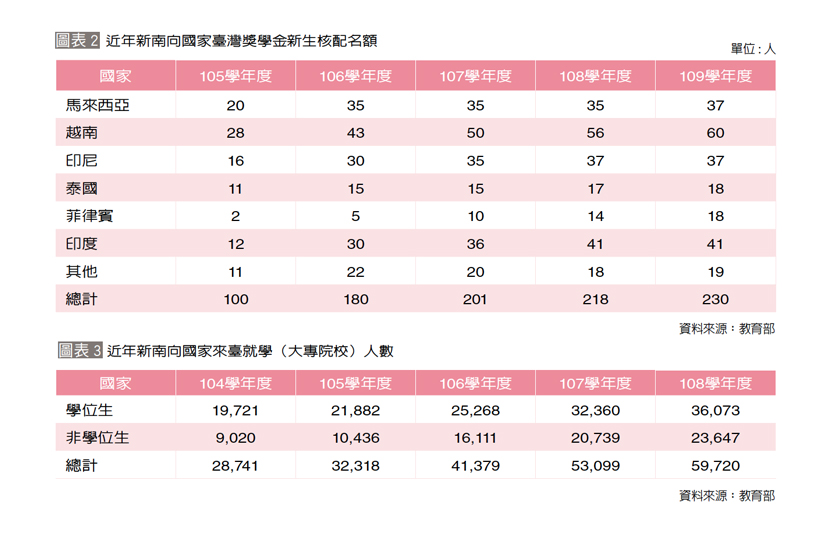 分析境外生的國籍組成,可以發現新南向國家來臺留學的人數從105學年度開始大幅成長,截至108學年度,總人數從3.2萬成長到接近6萬,成長率高達84.78%。原因在於教育部在當年擬定「教育部新南向人才培育推動計畫」,除了在馬來西亞、越南、印度、泰國、印尼、緬甸及菲律賓等國辦理臺灣高等教育展或招生宣導說明會,向東南亞的優秀學子招手之外,針對這幾個國家發放的臺灣獎學金人數配額,也調升超過一倍。