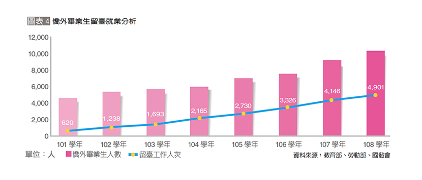 由於臺灣就業前景看好,跨國企業紛紛大舉來臺投資。根據高等教育國際合作基金會最新發表的「2020留學臺灣趨勢調查」,將近九成境外生認同留學臺灣對未來職涯是正確的投資。加上勞動部逐步開放僑外生的就業限制,在101年到108年累計46,542名僑外畢業生中,有20,819人次續留臺灣、投入就業市場,且比例逐年增加。從101年的620人次,到即將超過5,000人次,將臺灣培養的優秀人力留在臺灣,因應產業轉型需求。